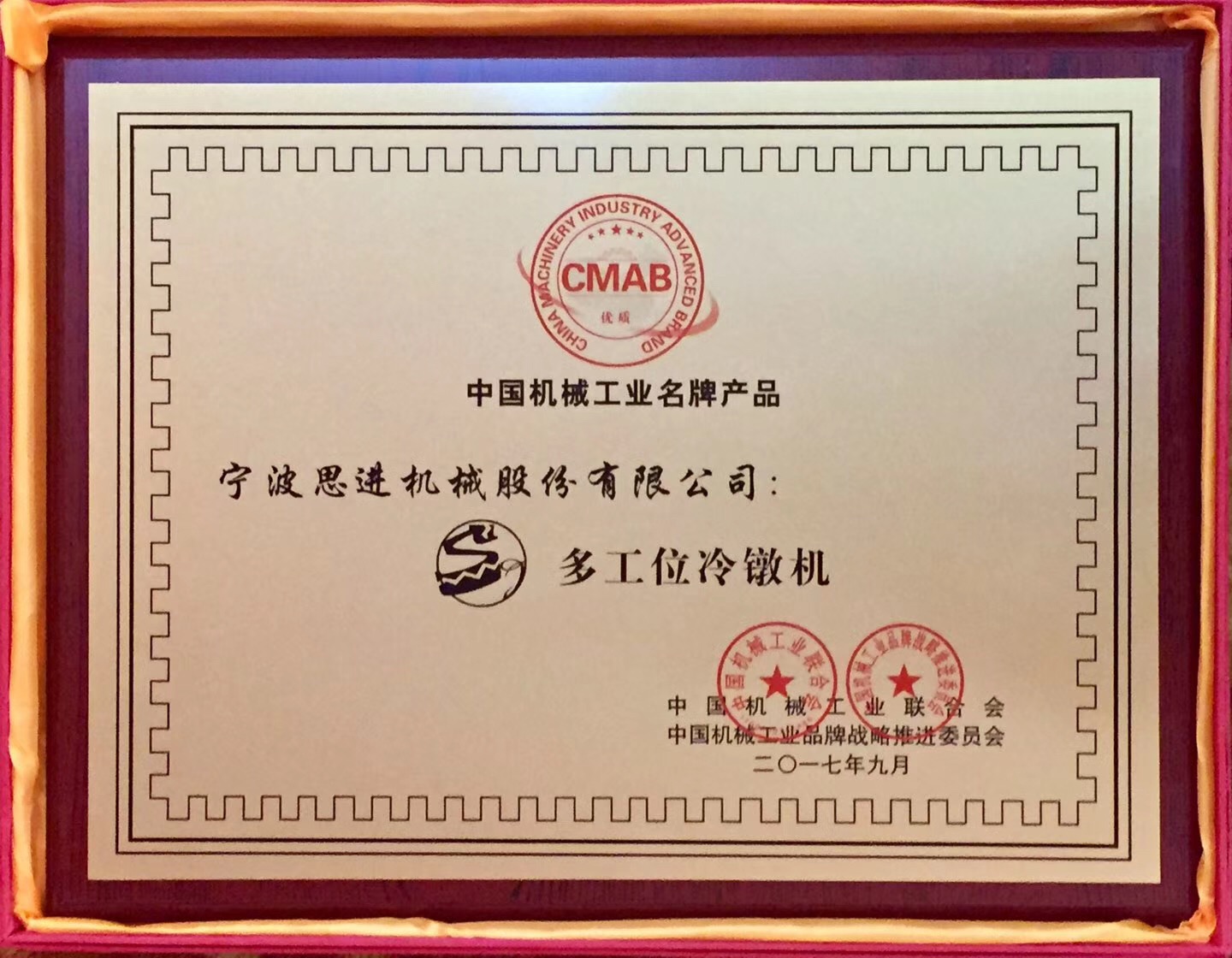 9月26日,“2017年中国机械工业质量品牌提升大会”在北京隆重召开。此次会议深入贯彻落实了《中国制造2025》、中共中央、国务院《关于开展质量提升行动的指导意见》及三部委《促进装备制造业质量品牌提升专项行动指南》的总体部署。会上,中国机械工业联合会、中国机械工业品牌战略推进委员会联合授予宁波半岛(中国)多工位冷镦机“中国机械工业名牌产品”荣誉称号。这是行业专业机构对宁波半岛(中国)一直以来坚持以匠心精神打造高品质产品的高度认可。