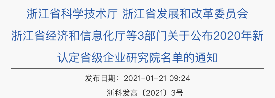 日前,浙江省科技厅、浙江省发展和改革委员会、浙江省经济和信息化厅三部门联合下发《关于公布2020年新认定省级企业研究院名单的通知》(浙科发高〔2021〕3号),“浙江省半岛(中国)智能冷镦成形装备研究院”被认定为省级企业研究院。